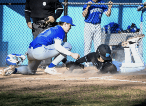 Rye Neck’s Jacob Wesemann scores the tying run during a game against Bronxville on April 2, 2022. The Panthers scored four times in the bottom of the 7th inning to top the Broncos in a rematch of last year’s Section I Class B championship game.